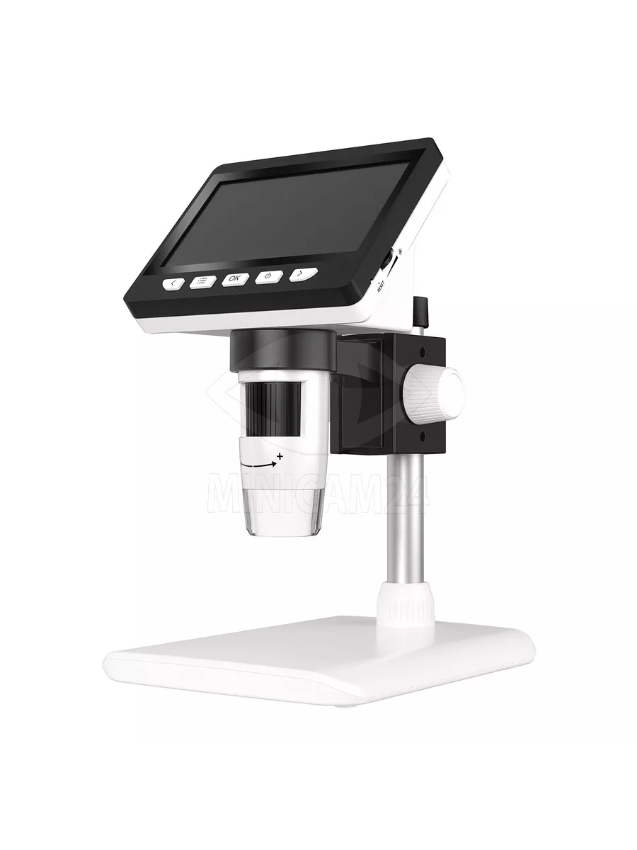Настольный микроскоп на основе цифровой камеры с высоким разрешением. Прибор оснащен цветным дисплеем диагональю 4.3 дюйма и светодиодами подсветки предметного стола. Питание от встроенного аккумулятора рассчитанного на 5 часов непрерывной работы. Запись фото и видео на ПК производится по кабелю.