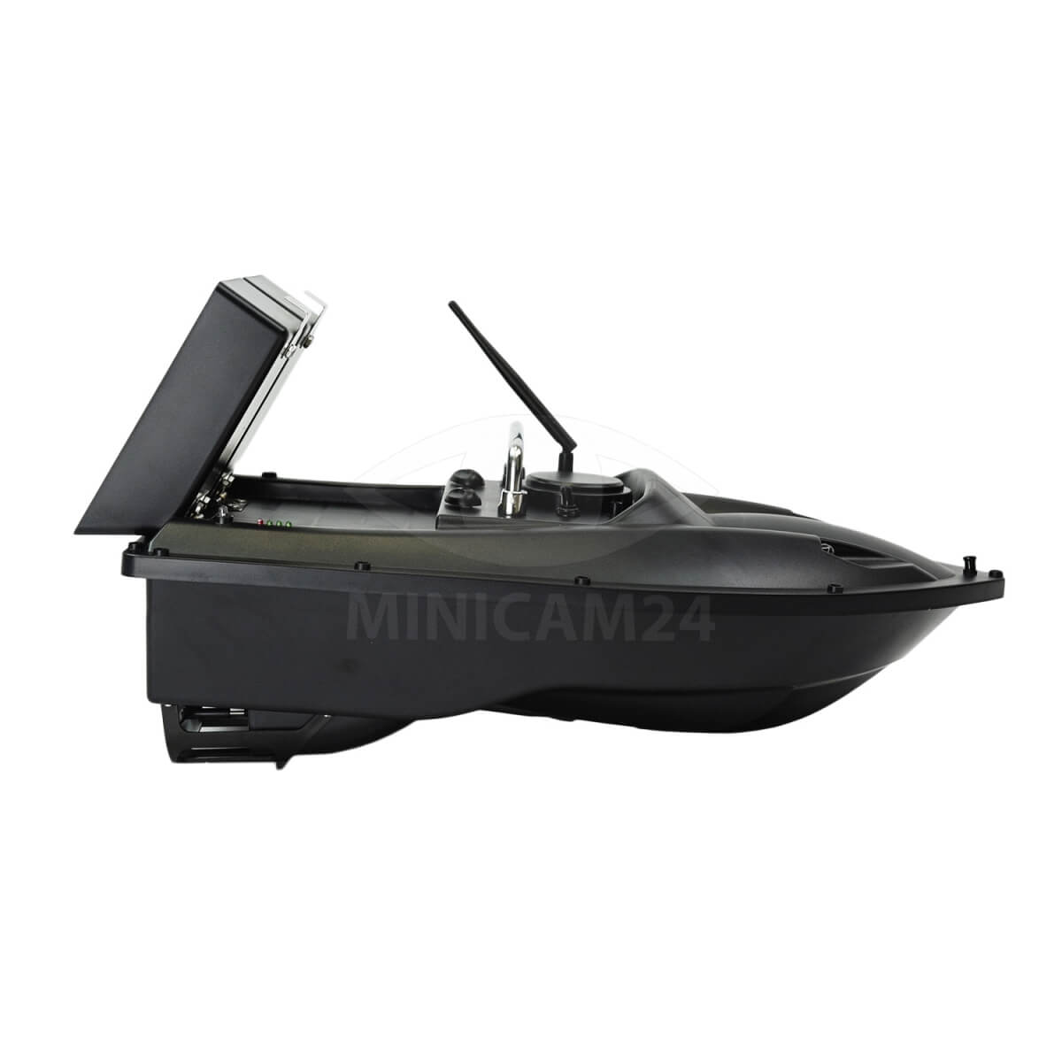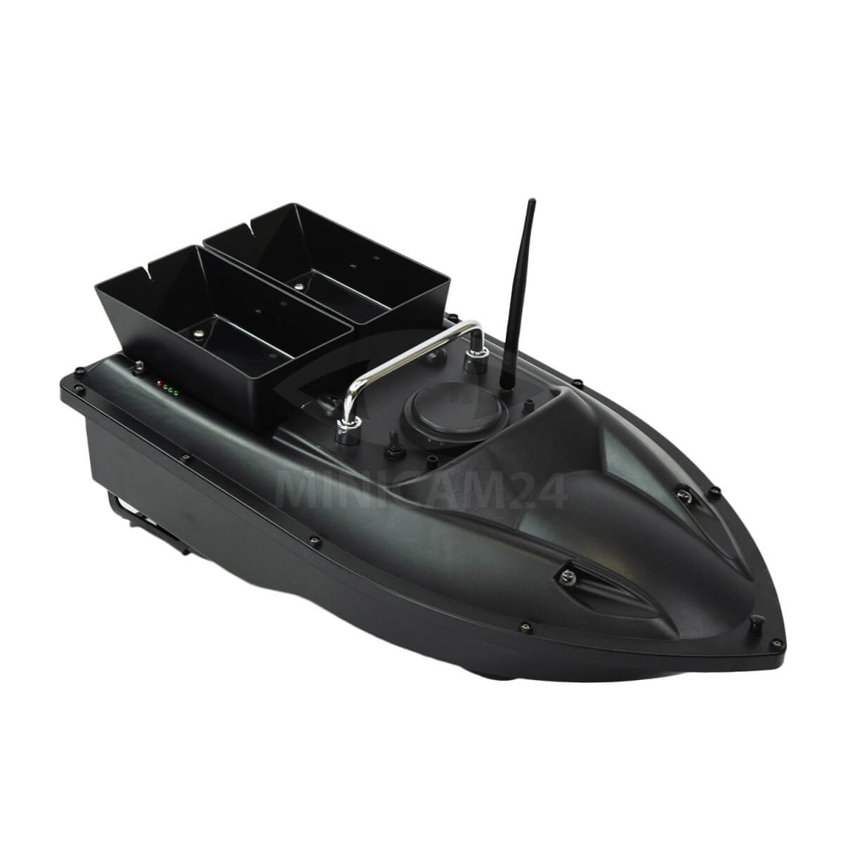 Устройство для прикорма рыбы. Управляется с помощью пульта ДУ на частоте 2.4 ГГц. Предусмотрено два вместительных лотка по 0.5 кг каждый. В букерах есть надрезы для надежной фиксации оснастки. Лодка оснащена двумя винтами, они позволяют развить скорость до 6 км/ч. На борту есть светодиодный фонарь, он облегчает управление корабликом в темное время суток. Центральная плата помещена в специальный резервуар, который защищен от влаги и конденсата.